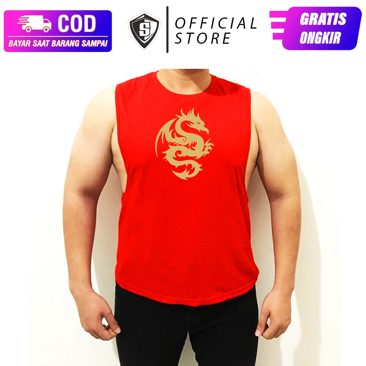 Kaos Singlet Lowcut Fitness Gym Muscle tee Golden Dragon StretchWA 087884599359